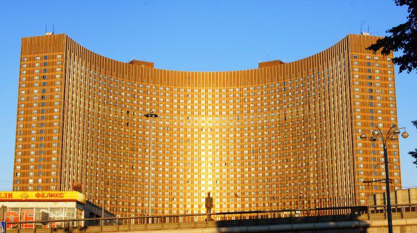 7月12日下午五点从谢尔盖耶夫城回到莫斯科市内,在一个专为中国旅游团吃饭的地方吃了此行最难吃的一顿饭,不到六点回到了酒店。团友们基本都要去看红场夜景,而我在刚来莫斯科时已看过夜景,所以决定去看上次没有看到的俄罗斯民间歌舞表演。知道民间歌舞是在宇宙大酒店的剧场演出,可导游只告诉我们酒店离那不远,步行就可以到达,但往哪个方向走没说,此时导游早不见了踪影;去问酒店前台的服务员,根本无法用语言交流,比划了半天谁也不明白谁的意思,怎么办?这时想起来宇宙大酒店在曾经去过的国民经济成就展览馆对面,我相机里有展览馆的照片。赶紧打开相机找到国民经济成就展览馆大门的照片,让服务员看,这下她明白了,把我拉到门口指了方向。