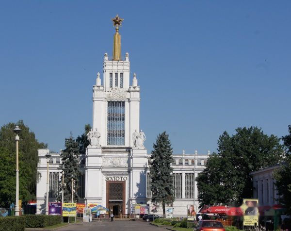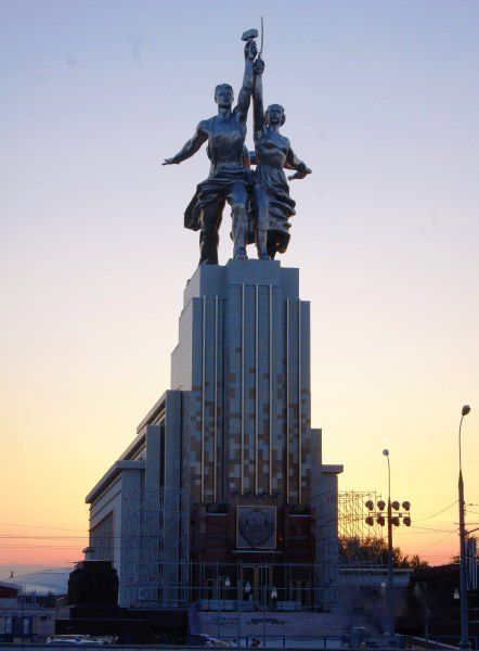国民经济成就展览馆正门。正门上的《工人与集体农庄女社员》的雕塑,是前苏联的一位女雕塑家设计的,曾于1937年巴黎世博会上装饰苏维埃的展览厅。也是当年苏联电影的标记。就像北京电影制片厂拍的电影在片头出现发光的天安门;八一电影制片拍的电影片头出现闪亮的五角星,像《列宁在10月》、《列宁在1918》等前苏联电影片头出现的就是这个工人和农民高举麦穗的雕塑。