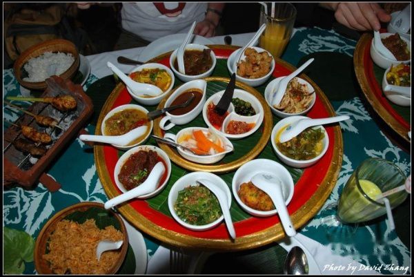 在Legian街和Pantai Kuta街交叉口的一家换汇店,汇率是Rp9400/USD1,也是No commission不收手续费,又换了200美刀。问了若干人终于找到了网上推崇的餐馆Poppies1。点了巴厘岛总汇Balinese Rijsttafel,全是巴厘岛风味的;还有牛油果汁Avocado Juice和柳橙汁Orange Juice,4个人花了Rp522k。