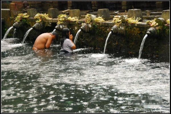 吃完上车去圣泉寺 Tirta Empul。圣泉寺是在回去的路上,天下起雨来。14:00到圣泉寺,门票6k/人。据说远古时有巫师在水中下毒毒害村民,大神因陀罗以矛刺地涌出泉水,解救了村民。这就是圣泉的来历。大多数当地人在参拜后,都会大桶小桶地往家拎“圣水”。