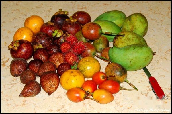 看完演出10:30,没在村里停留直奔京打马尼(1小时半路程)。路上有一些水果摊,老L提议买些回去,哈,这儿的水果可不便宜,统统20k/Kg,用的秤竟是铸铁的天平,左边放几个秤砣,右边放水果,大概齐平衡,还只能整公斤数,准才怪。买了点蛇皮果、山竹、红毛丹、青芒果、柑桔,还有两种不知名,花了16万。