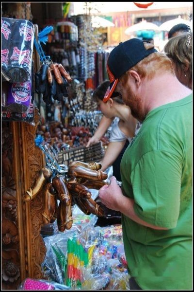 在一家网上说的可信任的安全换汇店换了点Rp,汇率不高:Rp9280/USD1。本来老L想到猴子森林看看,走到HIS日文情报站时间已不够,进去拿张乌布地图(复印的)往回走。到皇宫南门对面的传统集市转一圈,这是个摊位密集的自由市场,东西便宜,环境很差,各摊位都卖着几乎相同的工艺品之类的东西。奇怪的是有很多木制的阳具,有的还挺实用做成酒瓶起子,不知是否因为日本人喜欢,这个西方游客似乎也很感兴趣。