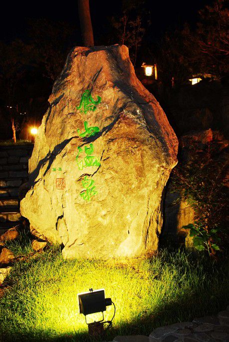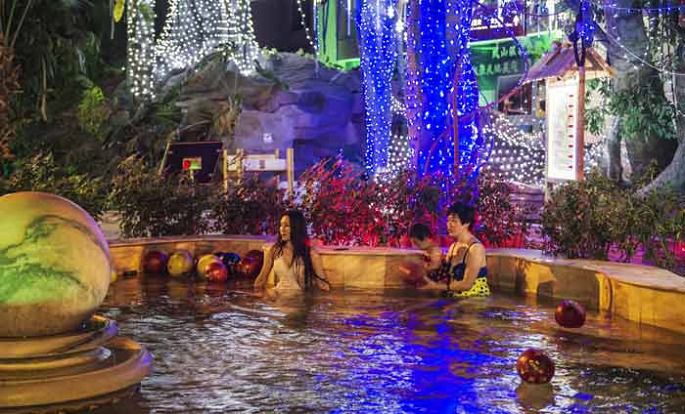 夜晚,整个露天温泉被灯光点燃,花草树木身披金缕霓桑,疑是银河飞落此间 。