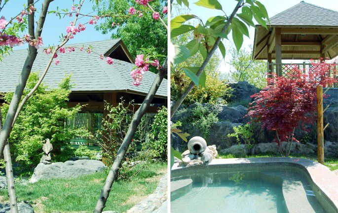 室外露天温泉依山势而建,十余个温泉小池隐藏在松柏、果树、花草中,亭台相间,清幽雅致,“虽为人作,宛自天开”。