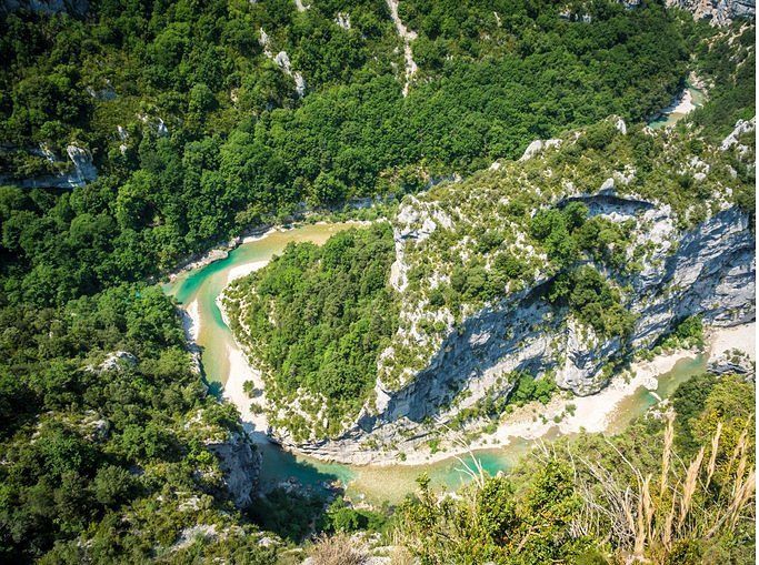 下一站,韦尔东峡谷,它位于法国南部的普罗旺斯地区,介于阿尔卑斯南部地区(Alpes du Sud)与普罗旺斯内陆地区(Provence intérieure)之间。是世界上最深峡谷之一,有欧洲大峡谷之称。听导游讲韦尔东峡谷还是很多攀崖爱好者喜爱的场所,攀登者把绳子绑在高达300米的宽阔的石灰石悬崖上,一堆堆汗留浃背的登山者在奋力攀登。这里也是欧洲许多大学的野外教学实习基地,峡谷特有地质的现象吸引了不少学生到这里实习。