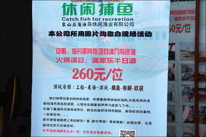 闲不住的石浦渔民们顺应潮流,在休渔期间推出了“休闲捕鱼”的旅游项目。为了发展经济,国家在这方面网开一面,给予了大力支持,休渔期间,虽然渔民不能出海打鱼,但是“休闲捕鱼”照常进行。