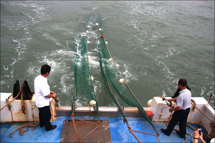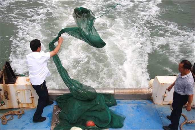 随着卷扬机慢慢转动,渔网徐徐滑向大海,最后在网上加了两块很有份量的铁块,将渔网沉到海底。