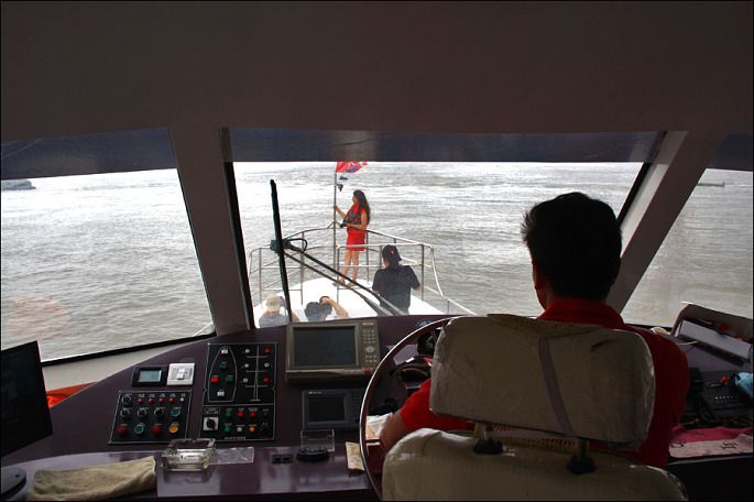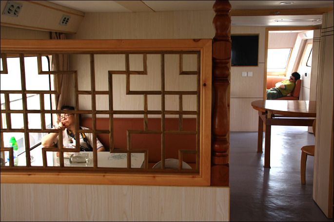 然而,大海毕竟是无风三尺浪。船只减速后,摇摆得反而厉害了许多。一个趔趄,椅子吱溜窜了出去,虚惊过后是一阵开怀的笑声……