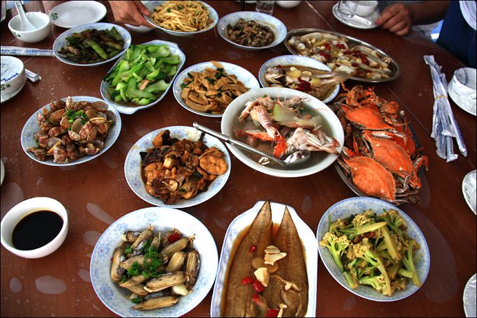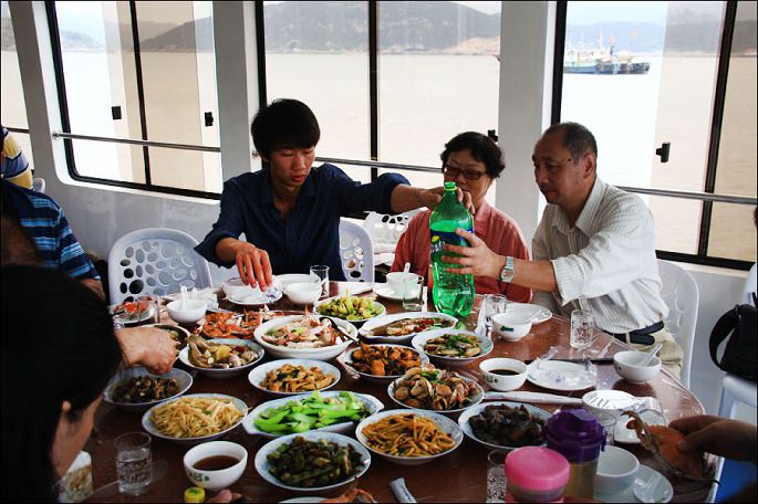 等到船只停到了港口,一切也就准备就绪,看看窗外的美景,望着满桌的美食,大家早已馋涎欲滴了,一场饕餮大戏即将上演……