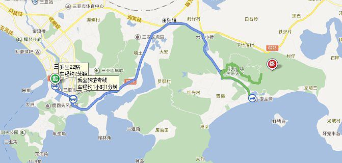 步行至海棠湾—乘坐23路公交车,在林旺下车—步行至迎宾路(三亚湾路)—乘坐旅游专线(大小洞天景区-亚龙湾)公交车,在海月广场下车—步行至南山景区