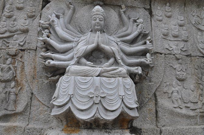 一百零八米的海上观音比自由女神还要高15米,乃世界最大的白衣观音造像并且是世界上最大的石像了。观音圣像一面是手拿莲花,另一面是手拿金书,还有一面是手拿佛珠。为正观音的一体 南山海上观音 化三尊造型,宝相庄严,脚踏一百零八瓣莲花宝座,莲花宝座高十米,共四层,每层有形状相同的二十七瓣莲花,共一百零八瓣,比灵山大佛底座莲花宝座多出二十瓣。莲花座下为金刚台,金刚台内是面积达15000平方米的圆通宝殿。