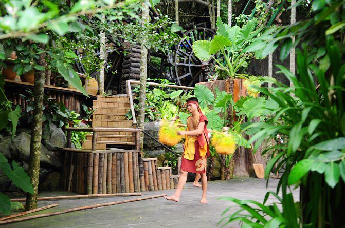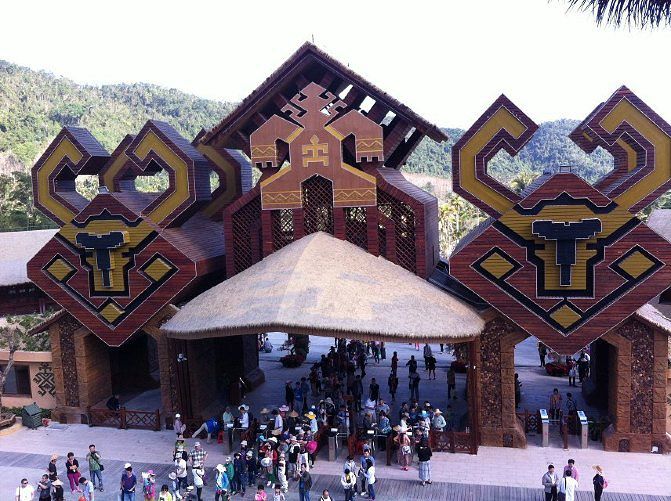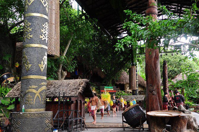 特别原始。我觉得这里蛮有意思的,反正我也没见过雨林,这样已经很不错了呢。其实景区不是特别的大,走着走着,我们就进入神秘的热带雨林区域。这里有原始的村民。很多牛头、羊头骨。这里叫做苗族狩猎文化区,我听路上的讲解员说这里是海南唯一一处真实展现苗族文化的地方。 景区里有很多的讲解员,一路上走到哪都可以听他们给花钱买讲解服务的人员讲述这里的故事,但是有一点让人特别不满意,就是景区的电瓶车,其实有很多,应该是免费给游客乘坐的。但是如果你不是团队游的客人,根本就不可能坐上这个观光电瓶车,大部分的车都写着VIP专属,上前拦截,他们就说车被包了。有很多散客有一些怨言,但是他们还是会理直气壮的告诉你,你有意见去园区管理处说理去,真是气死人的节奏。 一路上跟着苗族的兄弟们也可以学到简单地道的苗语,比如大喊一声“米公”就是你好的意思。整个狩猎区里还有一些手染绘的蜡染,还有古老的狩猎工具,最精彩的还有绝技表演,保证让你惊叹的合不拢嘴。