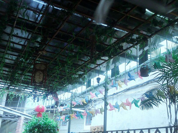客栈的布置很认真细致,绿色的藤类和五颜六色的纸风车,让人看起来心情无比舒畅。一层是用餐区。老板专门设了个茶座,招待远方游客。一进客栈,老板就招呼你喝茶了。