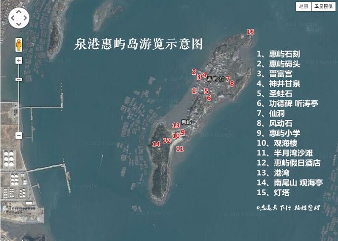 图3,而从卫星地图上看惠屿岛,它的形状更像是一只横卧在海上的龙虾,它由南北两座相连的小岛组成,北面临海处的山势成W状,两侧突出海面的半弧形山脊,俨然是龙虾的两条前足,中间凹陷处的山丘酷似虾头,虾头上裸露出两块天然巨石,恰好点成了虾目;虾身延伸至最南端的南尾,就更像是虾尾了。