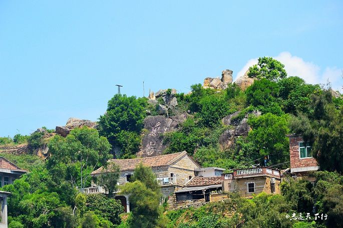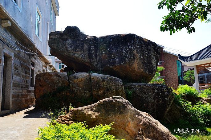 图9,继续沿着村路直行,有一块形似青蛙的巨石卧在一幢居民楼旁,这是一块见证了这个海岛历史变迁的圣石。据说石头下面那一个小小空间,便是岛上最早的居民——肖厝五祖侯妈及幼子栖息的地方,这是这个渔村的发源地,是他们的源头,他们似乎视这里为圣地,因此这块石头也被称为“圣蛙石”。