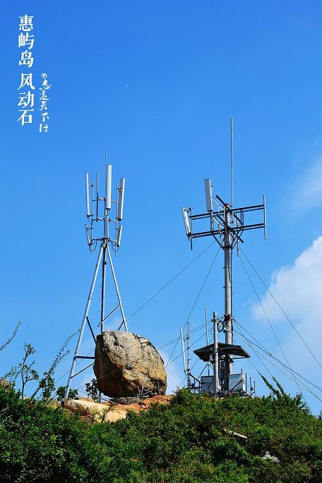 图12,在“仙洞”旁,有一块巨大的“风动石”,它虽摇不动,可比东山岛的“风动石”大多了高多了,也险得多了。每逢刮风打雷便隐隐传出“轰轰”之声,石头有摇摇欲坠之感。风平浪静时,立于这山巅岩石之上看四周景色,别有一番景致。