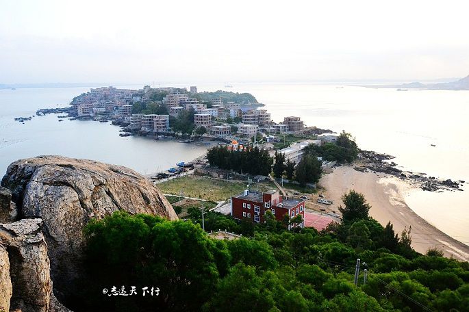 图19,而要欣赏惠屿岛全景和湄洲湾两岸风光,还得从观海亭继续向南尾山顶爬一小会儿,不过路不明显,需要格外小心。不过,当登临南尾山顶的巨石处,,惠屿岛一览无余,岛上远处的惠屿村,高低错落的民房,像一座城堡,固守着这座岛屿。近处是一片洁净的沙滩,因形状像一个月芽,我习惯称之为“半月湾”沙滩。在沙滩一旁,分别是已经废弃不用的惠屿小学和惠屿假日酒店。
