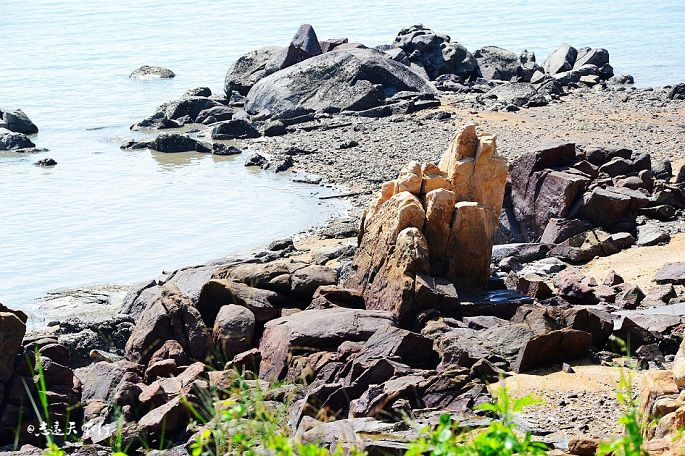 图21,惠屿岛上除了东边的那片沙滩外,岛的四周皆是几丈高的峭岩,给小岛环上一道坚固的城垣,挡地了汹涌的浪涛。崖壁下满是嶙峋的礁石,如兵阵布局森严,又如人妖鸟兽杂处其间,自具情态。