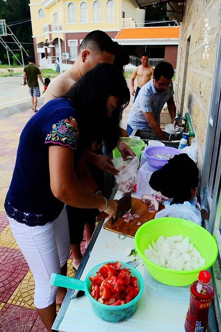 图33,冲完澡,顿觉清爽了许多。天气渐暗,大家齐动手去洗菜切肉,准备做饭了。