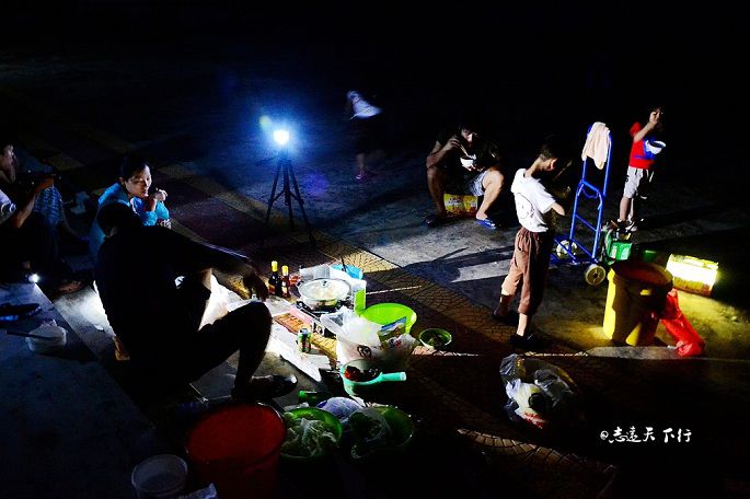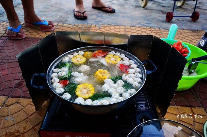 图36,考虑到携带大型的烧烤架不方便上岛,所以这次只准备了火锅。在出发前一天,我已经先去超市买了肉、蔬菜、火锅料、调味品、啤酒。也把锅碗瓢盆刀具都准备好了。等到了泉港,再从当地买了些海鲜、水果和烟花。我以为我把所有的东西都准备妥当了,但当我们准备煮火锅时,却发现煮火锅最重要的一个道具——锅忘记带来了,实在是汗眼啊,幸好学校餐厅里有锅可先借我们使用。