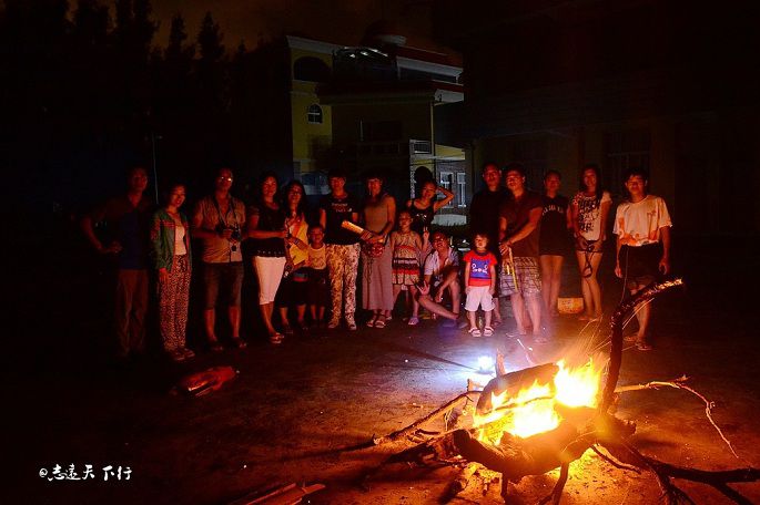 图38,然后晚间的娱乐节目隆重登场了。我们先在操场水泥地上,点上了一堆篝火,大家围在篝火前,合影一张。