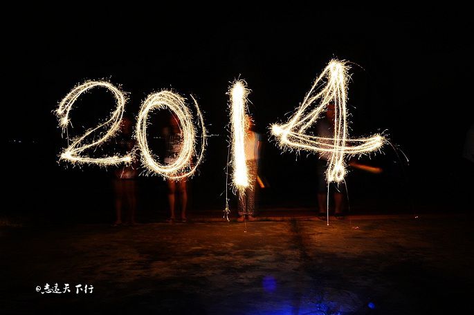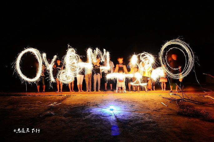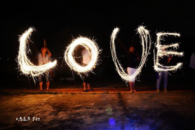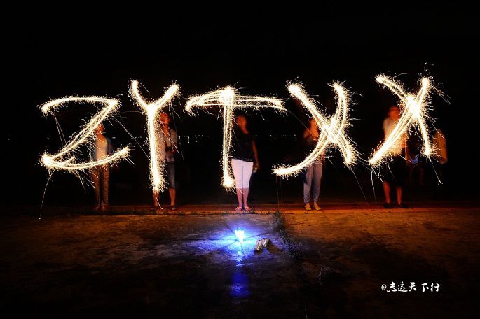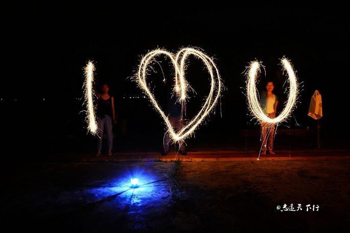 图43,最后,大家一起随便做出动作拍张合影。这个烟花秀的照片,其实是很好拍摄的。首先把相机设定为延时10-15秒拍摄,然后大家一起把烟花点然,在镜头前一字摆开,反着比划各自的字,需要注意的是,比划的时候,一定要注意按来时的轨迹退回去,这样字才不会乱掉。