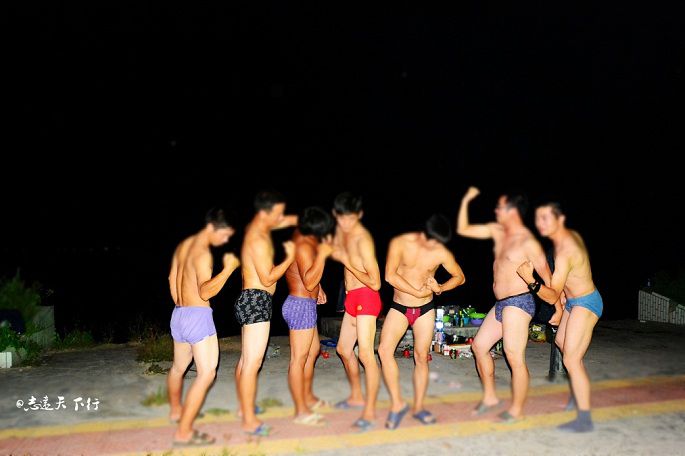 图45,但我们还没玩够,叫上在餐厅里几位老乡过来一起玩游戏拼酒,玩到半夜大家都已经入睡了,只剩下我们八人,然后我们就喝多了,然后不知谁提议,一起脱光衣服,然后就集体拍了这张合影(好像是我提议的,嘻嘻)。接着,大家一起下海,裸泳,是的,你没看错,真的是集体裸泳啊。记得去年我组织去惠安大竹岛露营时,到半夜也是集体去海边裸泳。没想到今年来惠屿岛露营,再次有机会裸泳。