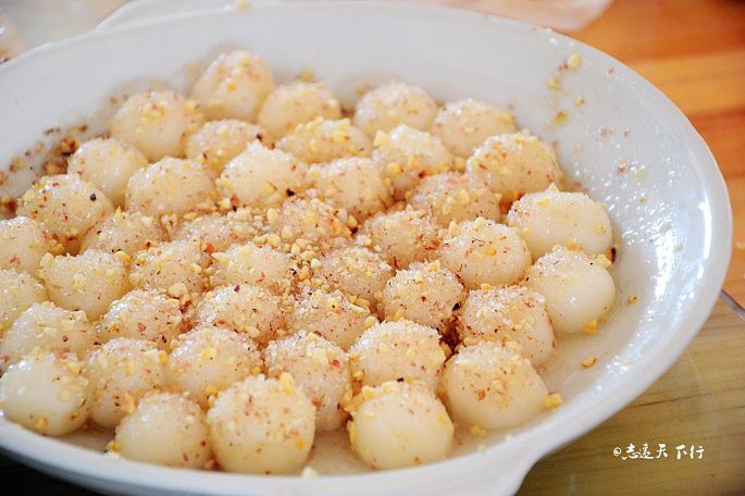 “糖粿”也是泉港当地著名的小吃之一,一般在七夕、中元、冬至、元宵时节,以及喜庆摆宴时常食用。它的做法非常简单,用糯米碾成粉,加适量水搓成丸子,放入开水中煮熟捞起,然后在上面撒上一层花生碎、白糖,即可食用。
