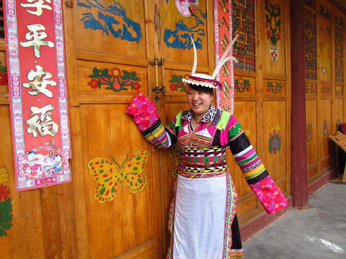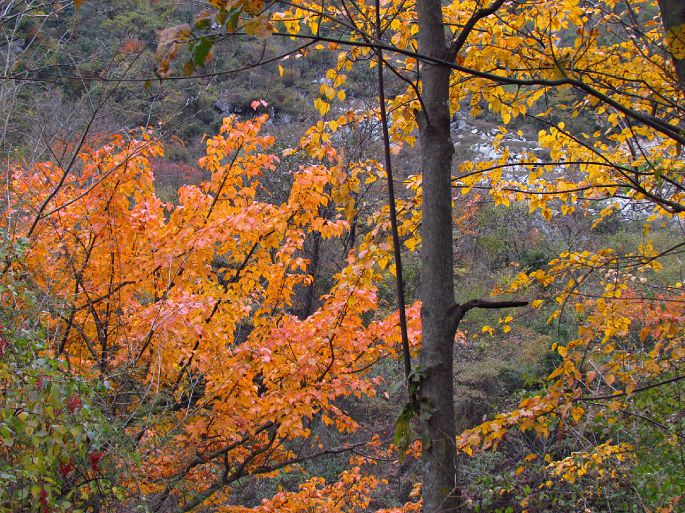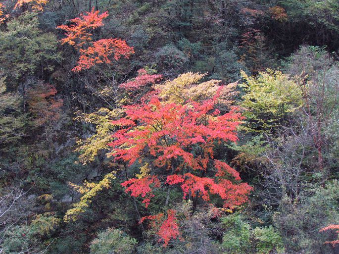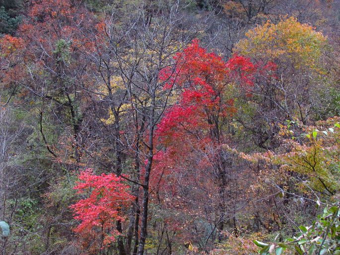 中午在南坝镇(又称江油关,三国时是蜀国的一道重要门户)吃午饭,那里的荞面凉粉和烧鲢鱼值得一尝。在5.12地震时,这些地方都是重灾区,灾后重建得不错,如今已看不到地震的影子。道路一直沿涪江向前,虽是去九寨沟的旅游线,但比起从汶川、茂县那边去的西环线,车少了很多。在平武县城,大家购买了些当地的土特产,主要是木耳和野生菌。出城后,进入峡谷路段,这一路夏天塌方不断,这段时间好了许多。随着海拔的上升,峡谷的景色越发美丽,金黄的银杏、赭色的杉树、红枫、白桦。同样的植物,生长在平原上的就不及山里艳丽,原因就在于昼夜温差大和强烈的紫外线照射。一路不时停车拍照,仿佛个个都是摄影家。按计划当晚我们入住白马藏寨,由于事前已联系好,大家也不急,把风景拍够后才走。