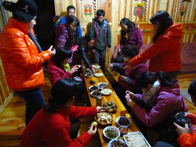 我们住在一李姓人家,这也是我多次去过的。随着天色渐晚,主人将晚餐摆上了长条桌,主食是煮土豆、烤馍、煎饼,菜有腊排、腊肉、炒牛肉、炒土豆丝、野菜、炖鸡汤,喝的是青稞酒。已是初冬时节,外面寒气袭人,室内升起了炉火。大家并排坐下,迫不及待地拿出各种电子设备,拍照、摄像、发微博......在温暖的屋内,啃着腊排、喝着青稞酒,酒精和炉火的双重作用让一个个红光满面,情绪高昂。菜上齐后,主人换上民族服装(之前为了做事方便,他们一般穿汉族衣服),提着酒,唱着歌,给大家敬酒。在那样的气氛下,早已是酒不醉人人自醉了。在屋内酒酣耳热之时,外面的篝火已点燃,激情的音乐已响起。在主人的带领下,纷纷出去围着火塘跳起了锅庄,直到夜深,方尽兴回屋睡觉。臧家乐的消费为组合式,吃住人均百余元。