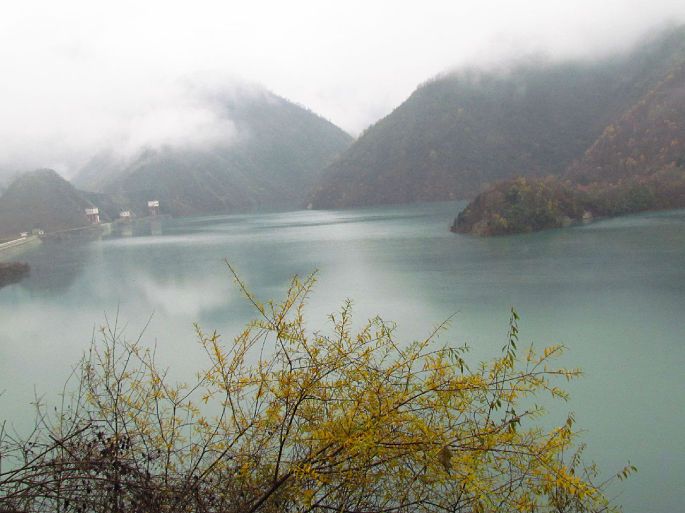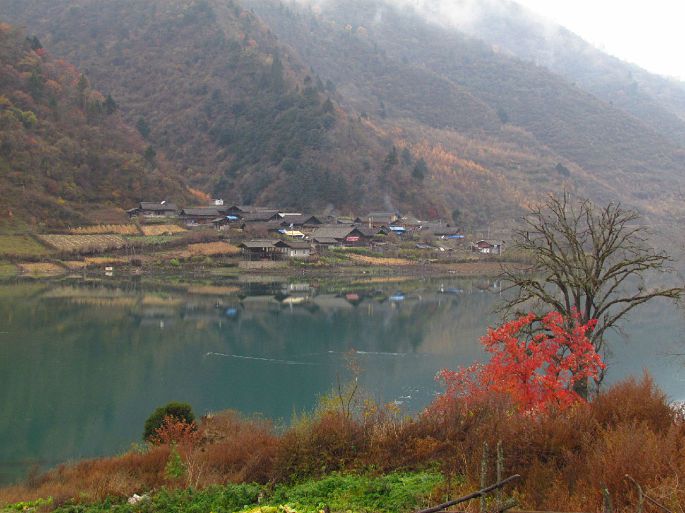 第二天吃罢早饭,大家继续向王朗自然保护区进发。出寨子不久,由于到景区的道路正在改建,加上昨晚一场小雨,道路有些泥泞。但很快,修建水电站形成的人工湖的美景让大家忽略了道路的不便。晨雾在湖面上飘荡,五彩的山峰倒映在深蓝的湖水里,岸边的红叶更艳。大家自然又是下车一阵狂拍。