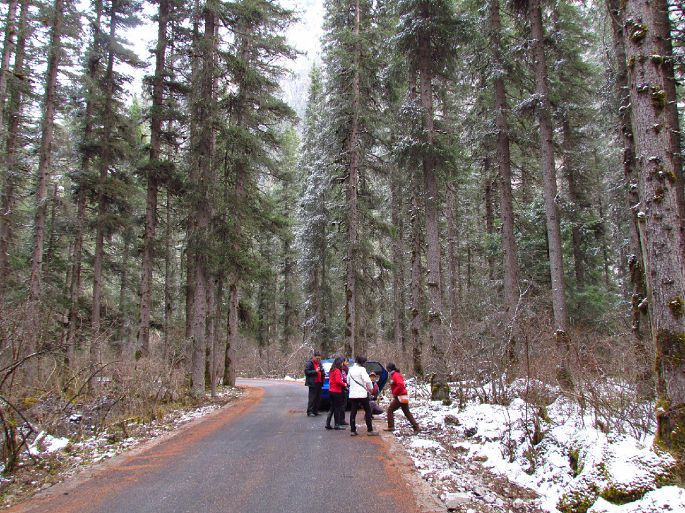 王朗自然保护区尚未正式开放,游人不多,每人收30元的门票。景区内的柏油路已修好,目前开放了两条沟,开车均能到达。道路在原始林中穿行,一路遇到好的景色可停下照相,如果时间充足,还可深入到沟里走走。由于已是初冬时节,山上已有积雪,5、6月份去的话可见到很多高山杜鹃,夏天一定是个凉快之地。