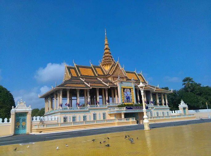 金银阁寺、它富丽堂皇,外有黄墙围绕,内有金殿、银宫等20多座大小宫殿,具有高棉传统建筑风格和宗教色彩,宫殿均有尖塔,代表繁荣;殿身涂以黄、白两色。