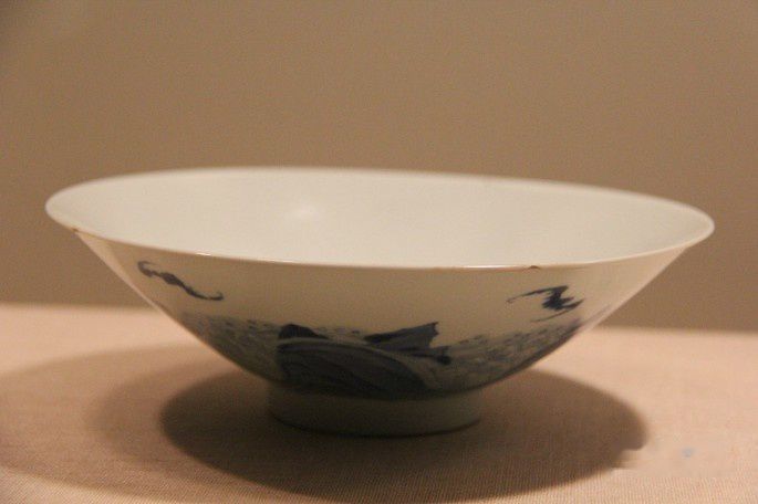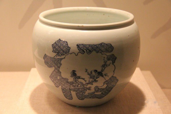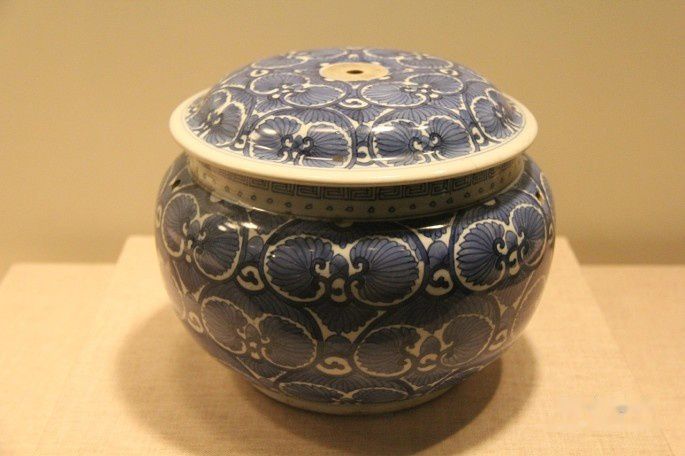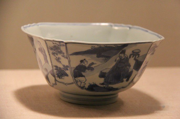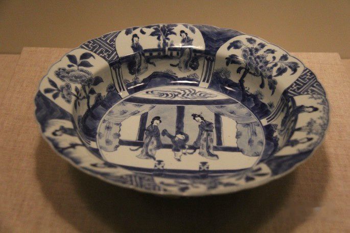 青花仕女花卉纹折沿花口盆,故宫博物院藏。