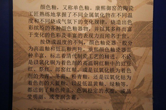 第二单元:纯正鲜丽的颜色釉瓷。颜色釉,又称单色釉。康熙御窑的陶瓷工匠熟练地掌握了不同金属氧化物在不同温度和不同烧成气氛下的变化规律,烧造出色彩缤纷的各种颜色釉器物,并以其多样而富于变化的色彩及丰富的表现力而闻名于世。按烧成温度的不同,颜色釉瓷器一般分为高温釉和低温釉两种。康熙颜色釉瓷器品种丰富,标志着清代制瓷工艺的精进。不论是以氧化铜为着色剂的高温铜红釉中的豇豆红、祭红、郎窑红釉,或是以氧化铁为着色剂的天青、冬青、粉青釉,还是以氧化钴为着色剂的天蓝釉,以及低温黄釉、绿釉等,都达到了釉色纯正、色调稳定的水准,或晶莹明丽、或莹润含蓄。