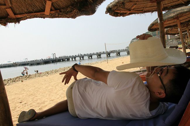 一大早叫醒的电话就响了,酒店自助早餐很棒,要说的是,跟团吃的东西真的很难吃,还不如每一顿都吃酒店自助早餐,哈哈,八点跟着导游挥舞着小旗子走大东海去了,三亚一大早的太阳就灰常腻害,酒店门口很多摆地摊的小商贩,买了顶帽子,一条纱巾,很便宜,三亚的市区很普通,没什么特色,市区里面房子都很低,没有特别高的高楼大厦,导游建议我们去大东海潜水,大家都兴致缺缺,就在海边放养了我们一个小时。。。。