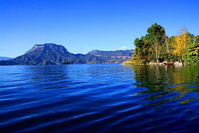 5:泸沽湖 泸沽湖位于宁蒗县北部永宁乡和四川省盐源县左侧的万山丛中,泸沽湖大落水村距宁蒗县城有73公里,距丽江古城200公里左右。泸沽湖为川滇两省界湖。为四川云南两省共有,四川约占总面积的2/3,云南占总面积的1/3。四川一侧湖岸线要比云南的湖岸线长得多。泸沽湖面积50多平方千米,海拔2690米,平均水深45米,最深处达93米,透明度高达11米,最大能见度为12米,湖水清澈蔚蓝,是云南海拔最高的湖泊,也是中国最深的淡水湖之一。湖中有5个全岛、三个半岛和一个海堤连岛,形态各异,翠绿如玉。吸引人们的还有一点就是住在那里的摩梭人们(阿夏走婚制)现在他们还保留着男不娶女不嫁的走婚制。