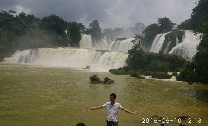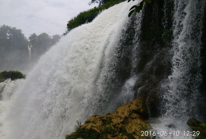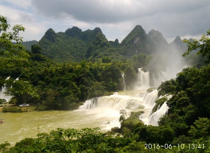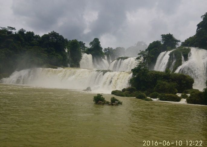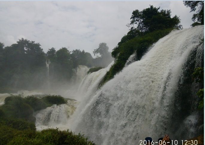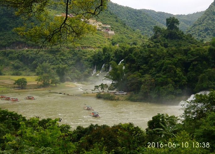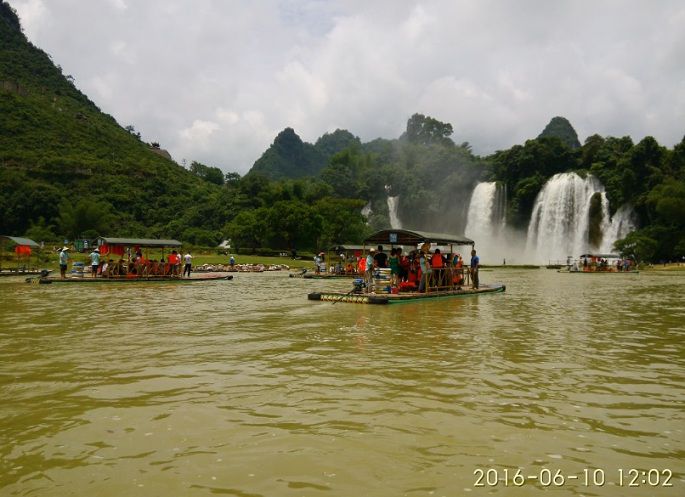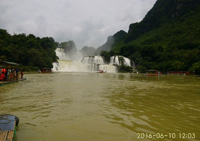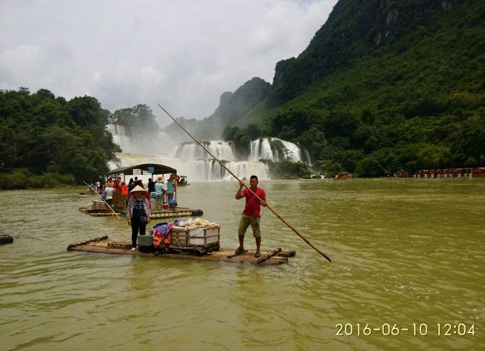 到了这里,竹筏还是一定要坐的,否则你就白来了,为什么呢?你想啊,中国与越南的边界是在归春河的中央,如果坐上竹筏,不单可以近距离看瀑布,还相当于享受了一次不用护照不用签证的出国游。水面上会有很多越南人的小竹筏一路尾随观光竹筏向游客兜售他们的商品。竹筏划过德在瀑布的正下方,水气很大,手机都湿了,拍出来的相片蒙蒙胧胧的,这时,如果有阳光,而你够幸运的话,你可以看到非常彩虹,可惜当天的阳光不是很够,也许那天我们的运气不佳,没有看到彩虹。