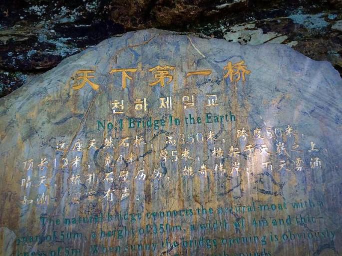 所谓天下第一桥,就是一块厚5米的天然石桥,横空架在两座山峰之上,连接两峰。高度,跨度和惊险均为天下罕见。照拍不全,此处看介绍自行想象。
