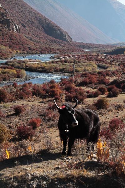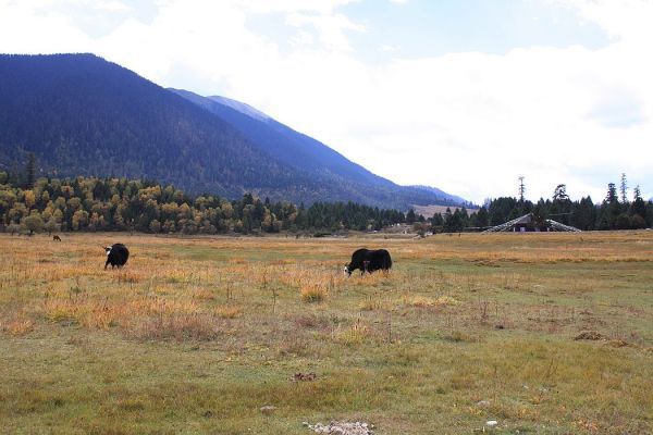 在第三天从波密返回林芝时又经过鲁朗,我们下车流连了好一阵,看看山看看水,看看蓝天白云,看看秋后金黄的树叶,那种金灿灿的颜色应该只属于西藏吧,那是一种另人心悸的颜色。记得有部电影的台词是:“我喜欢那种颜色,那是幸福色”。多年来,我一直在寻找“幸福色”,那么当下,我是找到了-------还看到那悠闲自在的牦牛,或一个独行,或三两成群,或两头对峙,都是那么恬静,真实的所在。