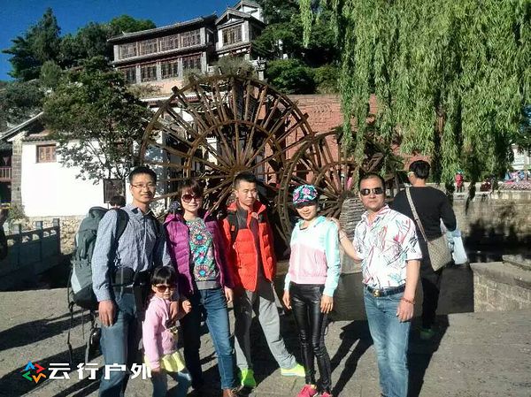 出发前的合影,一行六人在丽江古城的标志—大水车前合影
