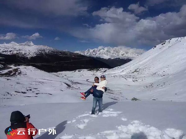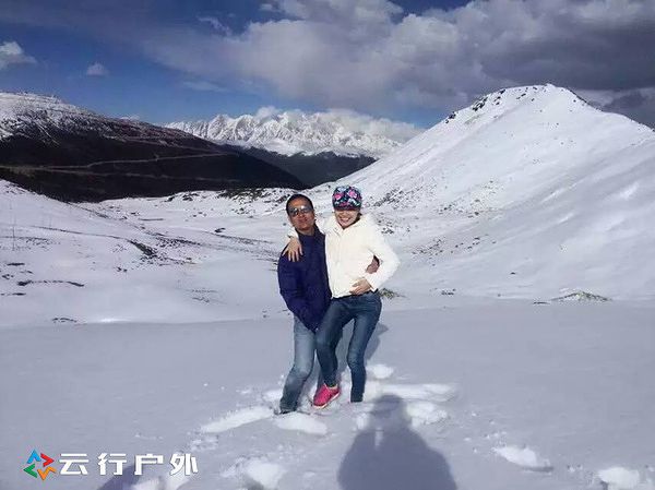 同行的帅哥抱着媳妇在雪山垭口留影
