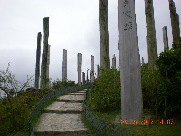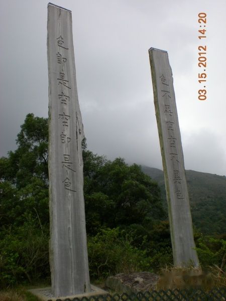 顺着指示牌走进茶园,然后就到了心经简林,36根木柱巍然耸立,刻的好像是《般若波罗蜜心经》,顺着石阶逐级往上,发现最中间的一块木牌上居然是空白的!整个心经看下来,就看懂了一句话:“色即是空空即是色,色不异空空不异色”= =