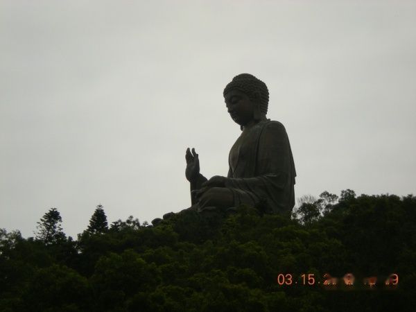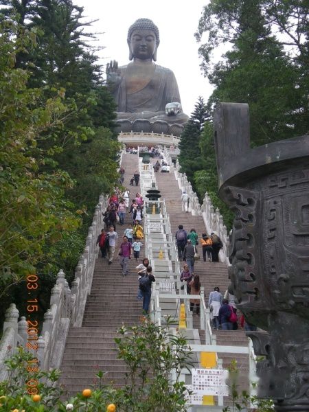 到梅窝码头后转乘2线巴士到昂坪,大约35分钟吧,下车正好是大佛的入口,中间是菩提道,两边是十二生肖神像,走过去右手边就是天坛大 佛。一眼望去是老么长老么长的台阶,不过好在能看到尽头(我的要求越来越低了= =),据说是260级台阶,到了第二层,就不让游人继续登了,大佛的下面有六个守护的小神坛,神坛外面的围栏上明明有写“请勿投币,免损阴德”,可是每个 神坛的莲花座上还是有不少的硬币,看来不怕损阴德的人还是蛮多的= =