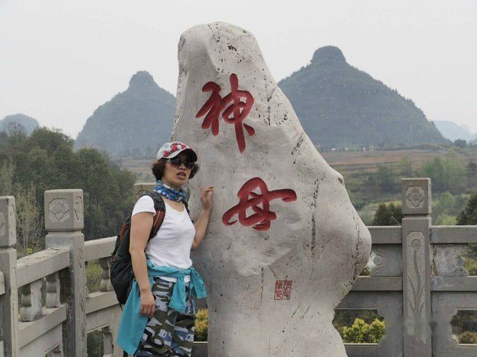往前走一里路,又像是成熟女性的双乳,丰满圆润。站在这个观景点从右往左,先映入你眼帘的是一组山,恰似一个平躺着的孕妇,有头有胸有怀孕十月的肚子,然后是生产后正在哺乳的双乳,非常绝妙,十分的逼真。当地布依族人尊称她为神母。