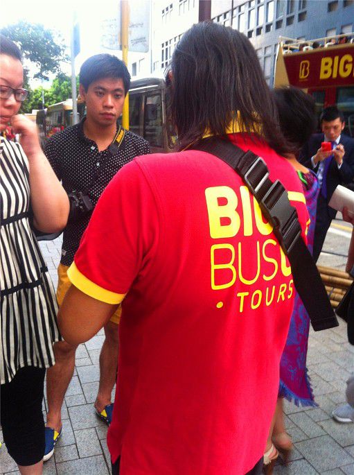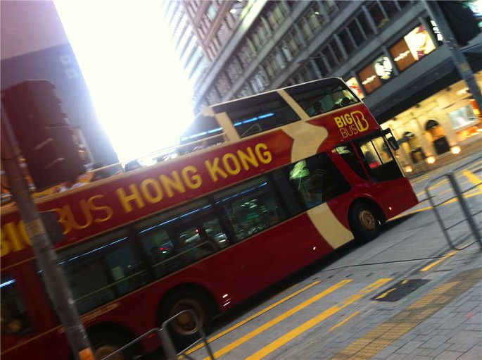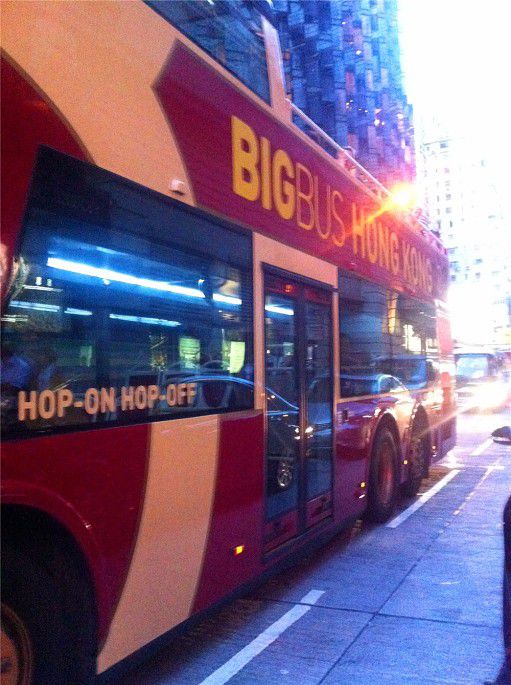 车,长这样子,红底黄字,很醒目。离十万八千里大概都看到,所以不害怕坐过了班车,工作人员的衣服也很抢眼。Big Bus Tours夜游在尖沙咀中間道半岛酒店办公楼对外集中。