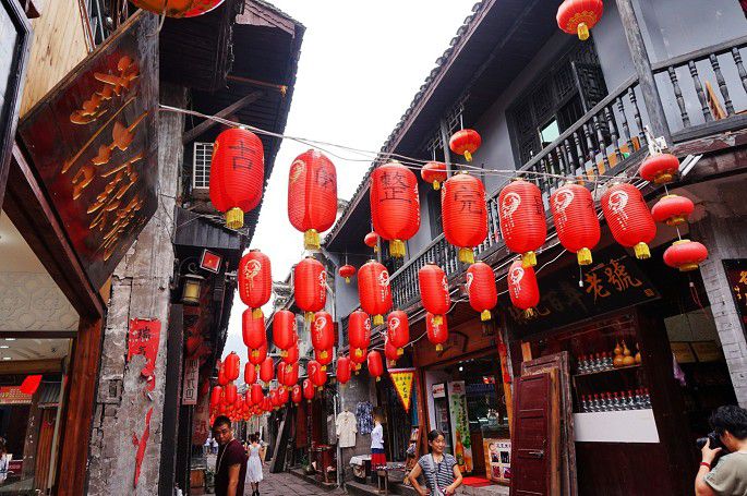 在各种形状的建筑上,或镶嵌着五颜六色的彩灯,或闪耀着形状各异的霓虹灯,或安装着明亮耀眼的投光灯,或树立着各种华丽的店铺招牌、广告灯。古老的吊脚楼上,悬挂着一排排的大红灯笼,传递着喜庆、吉祥的信息。闪亮的灯光映照在水中,就像是传说中的神话世界,更给古城增添了几份神秘。