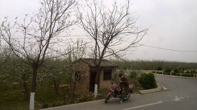 出庙,回到大门对面广场,让一小伙帮忙拍照。他张家界的,沿黄河行走,好样!过新城村,到不远汽车站,上去荣河的车,很快到太赵村南口,旁有一中学。还有2公里多路程,走去。苹果树开花,有人在采花授粉。没多远,一拉砖的奔马车停下,主动载咱一段,带眼镜的兄弟,真好!