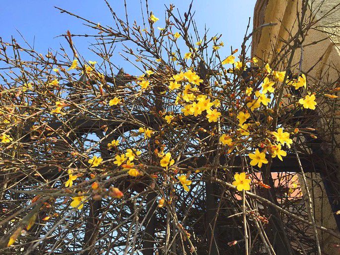 走到近处,惊喜的发现铁栏杆外围上的迎春花竟然开了,春天真的悄悄的来了,多年前的海子一定也会为一花一草感到兴奋吧,所以他才会写出—活在这珍贵的人间,人类和植物一样幸福。