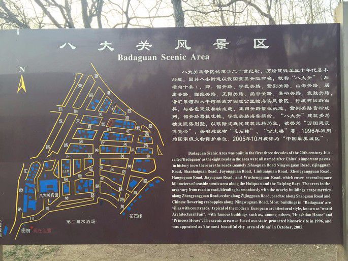 与老板娘借了充电器,休息片刻,走到马路边看到一个大牌子,原来距离八大关和海洋馆都很近哦。海洋馆并不想去,还是沿着路往下走,走着走着就又可以看到了大海,写着第一浴场,再不远就是八大关了。